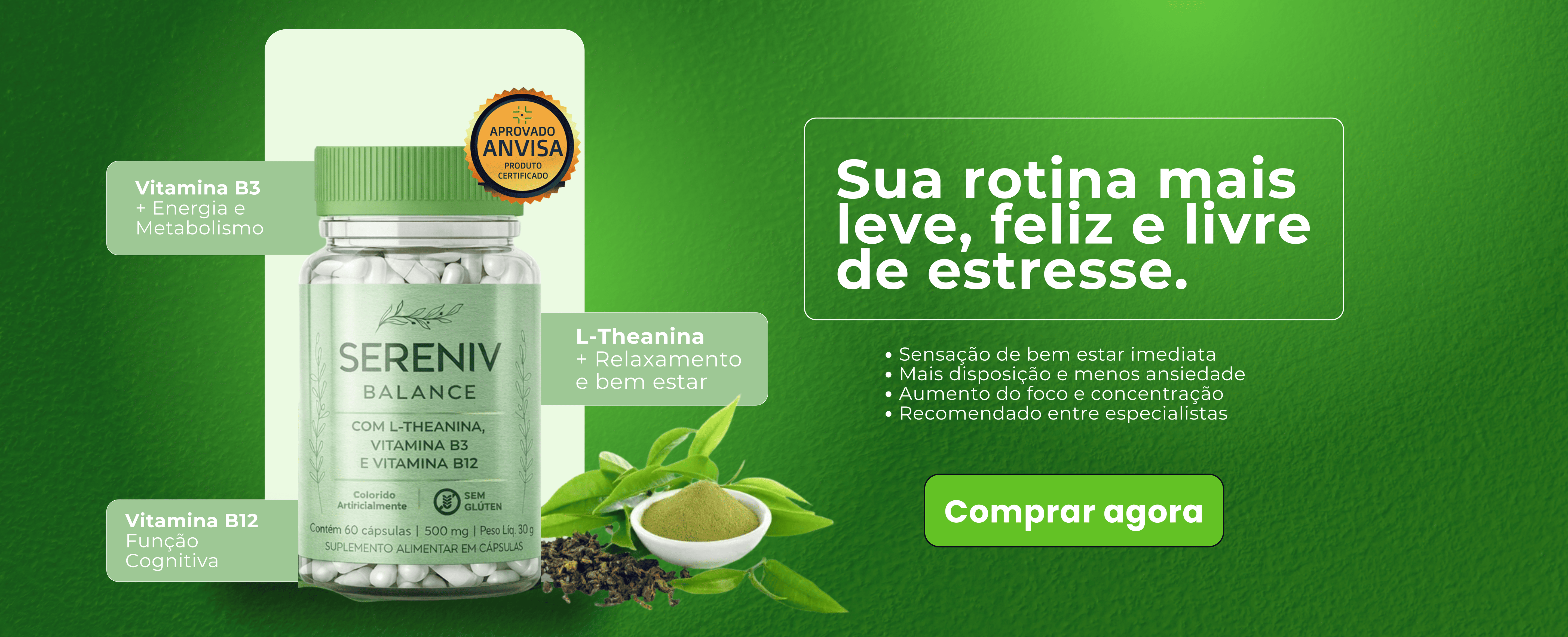 O Sereniv Balance é composto por ingredientes natuais como vitamina B3, B12,D3, Celulose Microcristalina e L-Triptofano que auxiliam seu dia a dia.