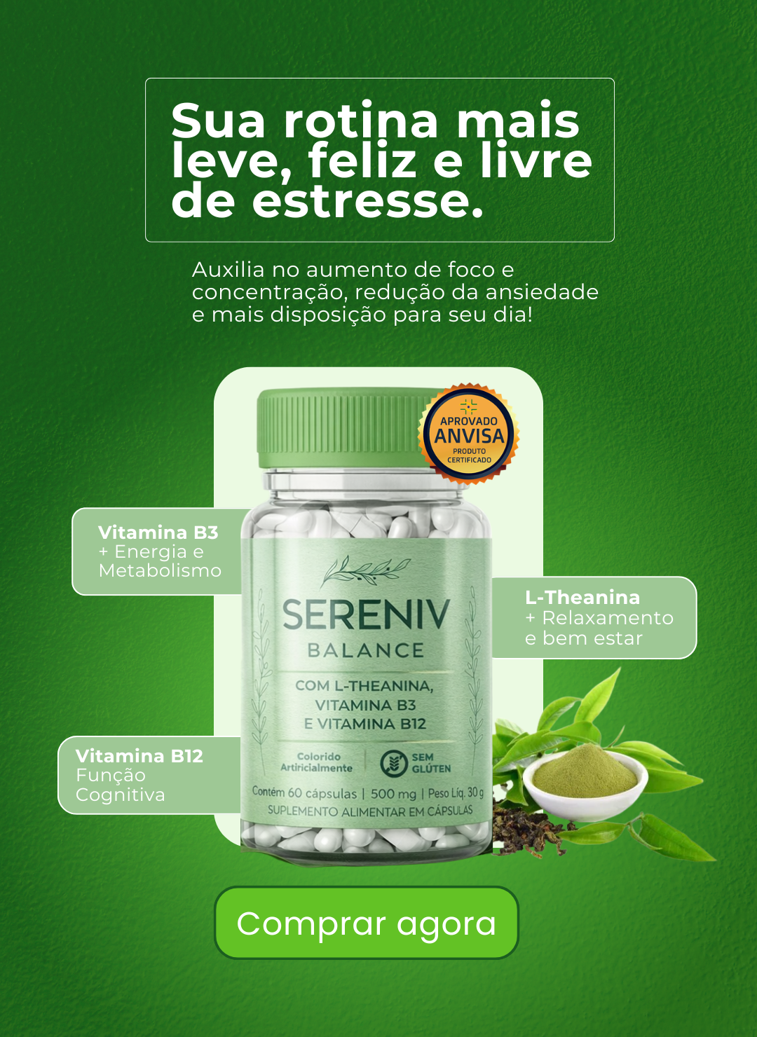 O Sereniv Balance foi desenvolvido para ajudar a restaurar o equilíbrio mental e emocional. Sua fórmula combina L-Teanina com Vitaminas B3 e B12, nutrientes essenciais que auxiliam no bem-estar, no foco e na disposição mental.